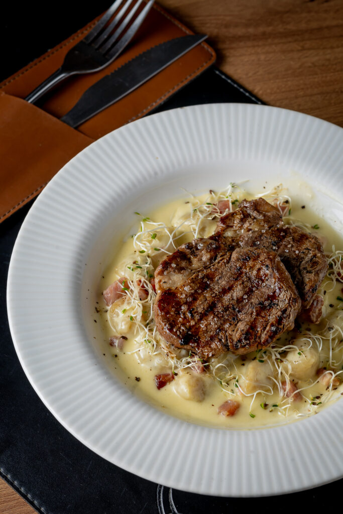 Spaghetti ao molho alfredo c/ Bife Chorizo Um maravilhoso spaghetti feito ao molho branco, acompanhado de um saboroso corte de Bife Chorizo. R$ 73,90